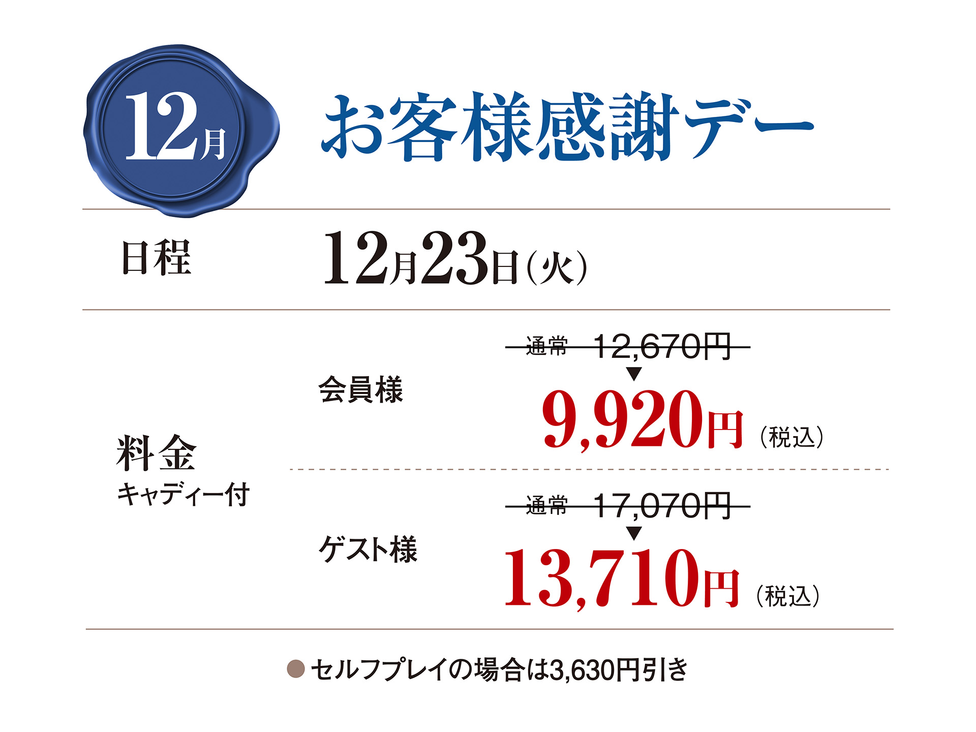 倶楽部特別企画「お客様感謝デー」では、通常価格よりお得なプレイ料金でご利用頂けます。会員の皆さまのみならずゲストの皆さまも是非ご利用ください。