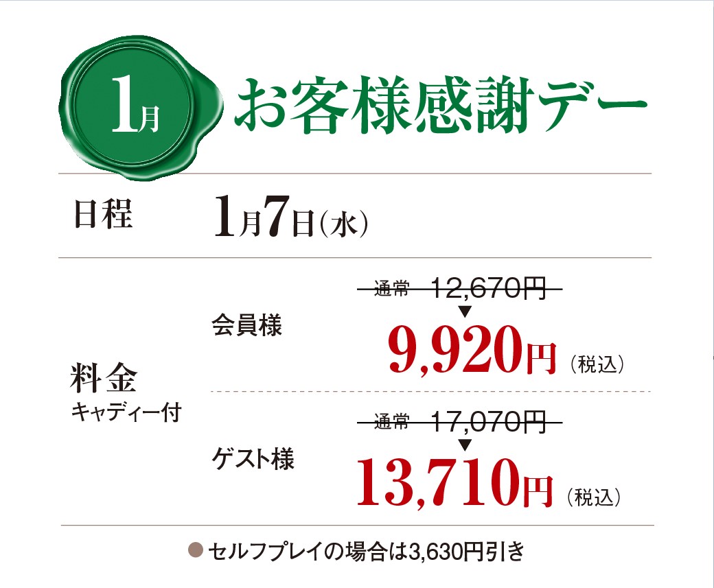倶楽部特別企画「お客様感謝デー」では、通常価格よりお得なプレイ料金でご利用頂けます。会員の皆さまのみならずゲストの皆さまも是非ご利用ください。