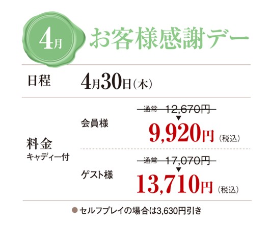 倶楽部特別企画「お客様感謝デー」では、通常価格よりお得なプレイ料金でご利用頂けます。会員の皆さまのみならずゲストの皆さまも是非ご利用ください。